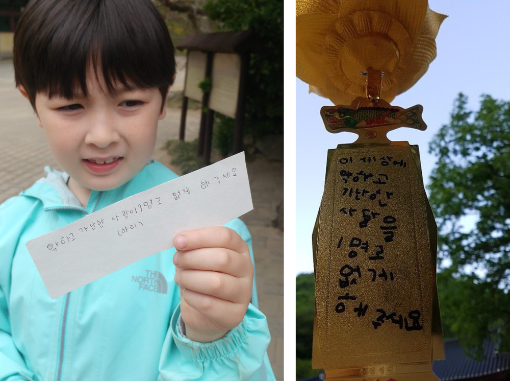 저희 부부는 영국 워릭대학교 불교동아리에서 인연을 맺었습니다. 불교는 저희 가족의 중요한 가치이고 사찰은 저희 가족에게 언제나 평안한 휴식의 장소이자 세계를 확장하는 공간입니다. 위의 사진은 하리가 8살 때 부처님 오신 날 적은 소원이에요. 지금은 하리의 소원이 많이 달라졌지만요^^